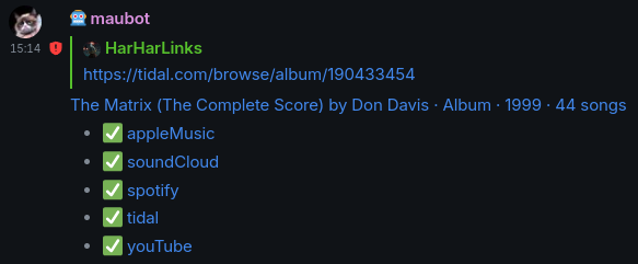 So after a bit more tinkering, I have released v1.1.0 of my plugin https://github.com/HarHarLinks/maubot-idonthavespotify. It can now also be configured to check for any combination of spotify, apple, deezer, soundcloud, tidal, and youtube, which are all supported by idonthavespotify to different extent. Your mileage may vary depending on what you search, but that's up to the upstream project, since the plugin just connects whatever it does to matrix.